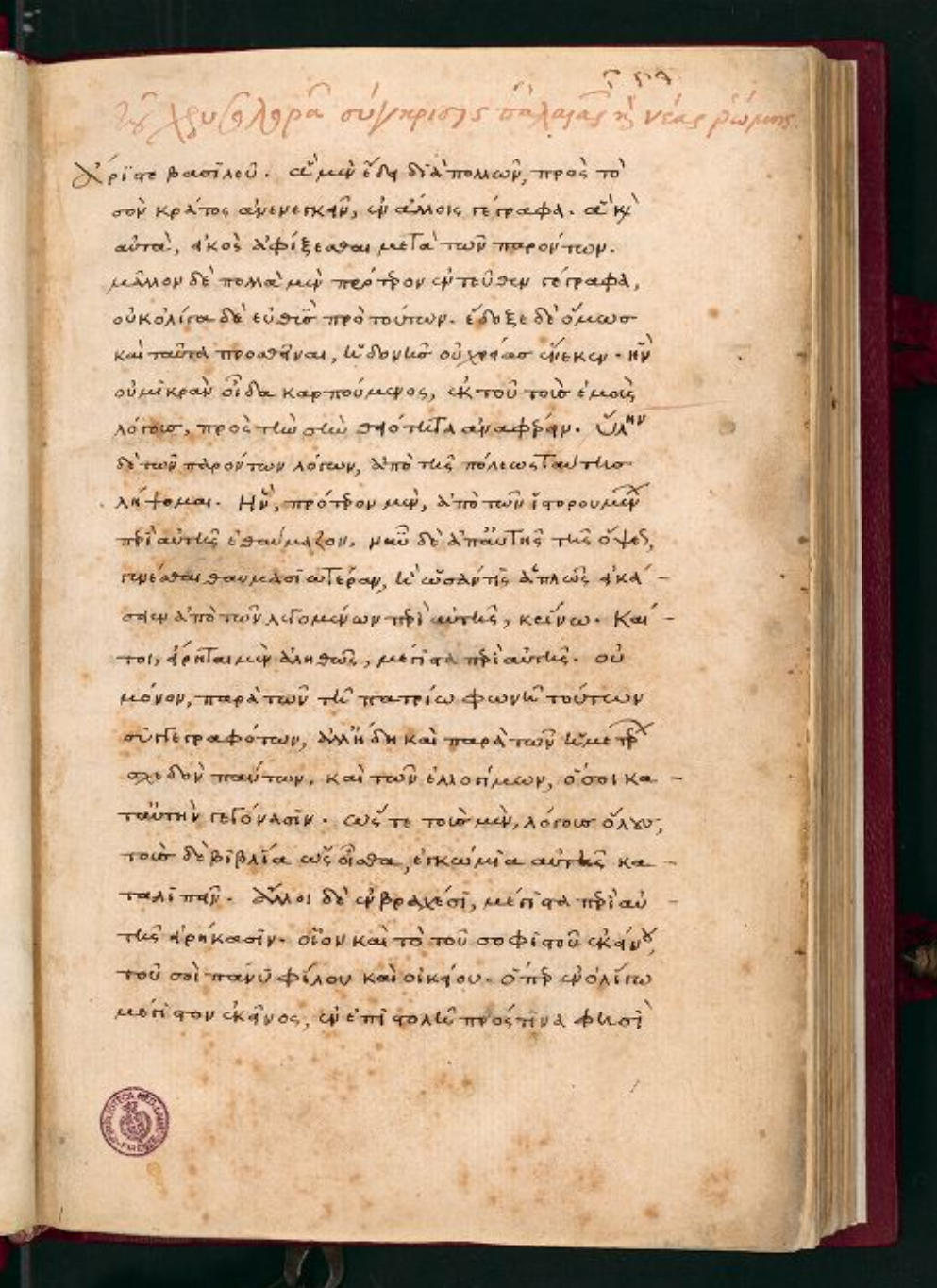 Source: https://commons.wikimedia.org/wiki/File:Manuel-chrysoloras-paolo-uccello-louvre-15th.jpg (last accessed: august 2024) - Manuel Chrysoloras, Letter to Emperor Manuel II Palaeologus, Rome, June-July 1411, Manuscript copy in the author’s hand. Florence, Biblioteca Medicea Laurenziana, Plut. 6.20, fol. 1r.